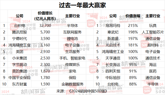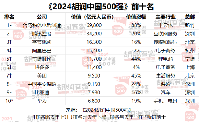 2024胡润中国500强榜单揭晓:台积电蝉联榜首,华为强势回归前十半导体行业领跑价值增长,台积电一年增值相当于一个腾讯17